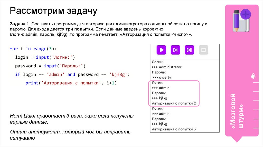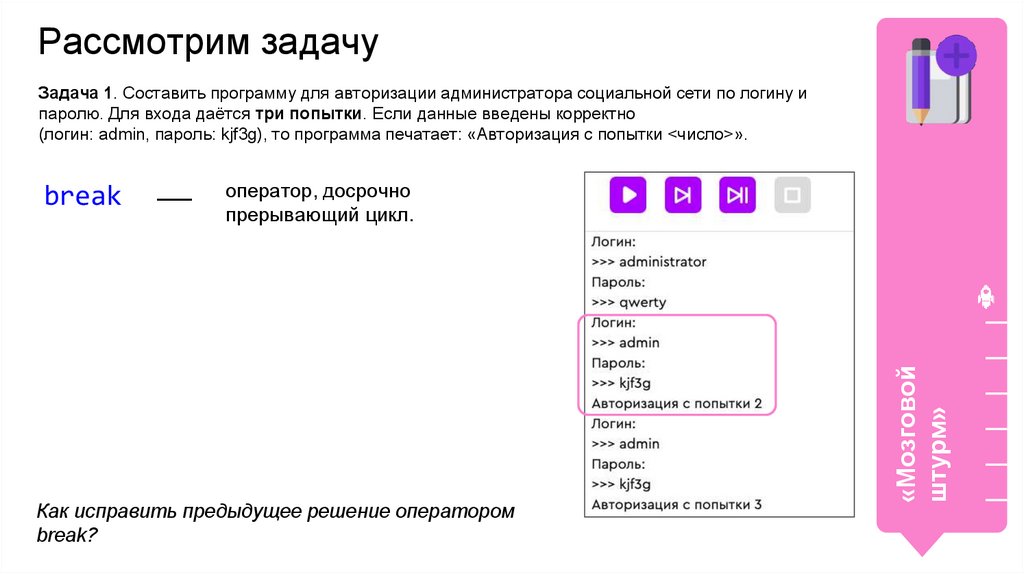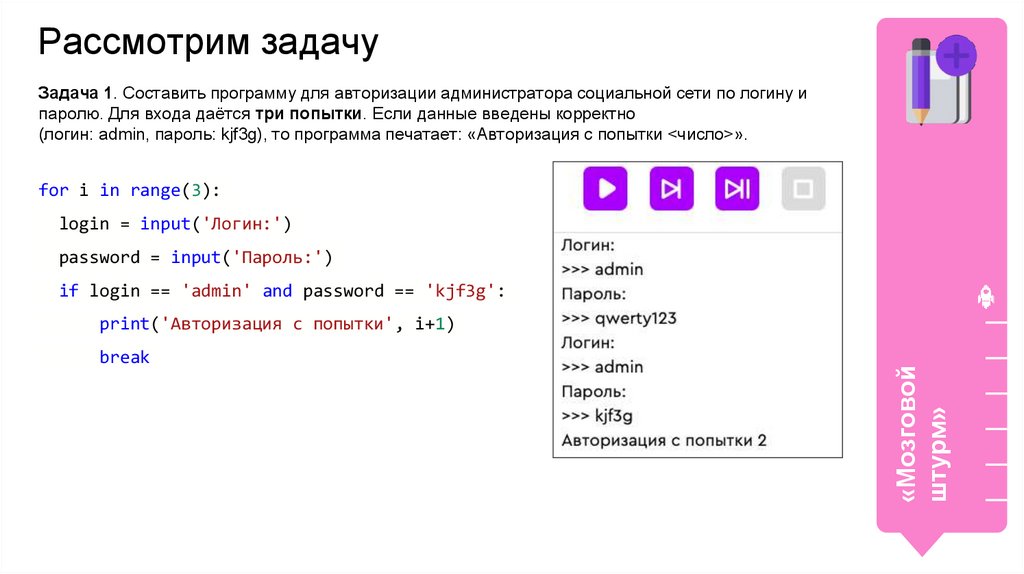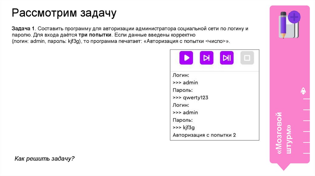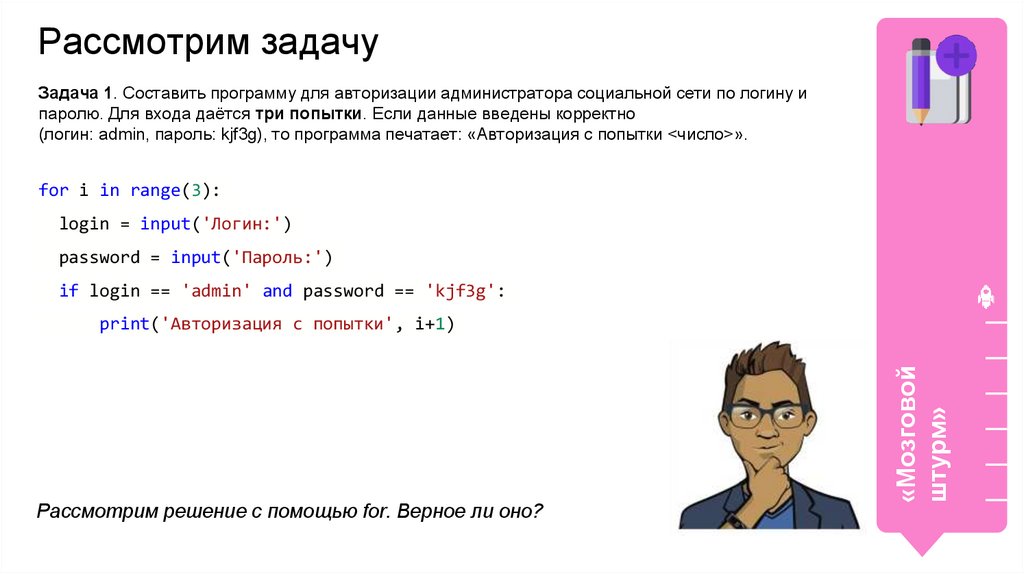 Рассмотрим задачуЗадача 1. Составить программу для авторизации администратора социальной сети по логину и