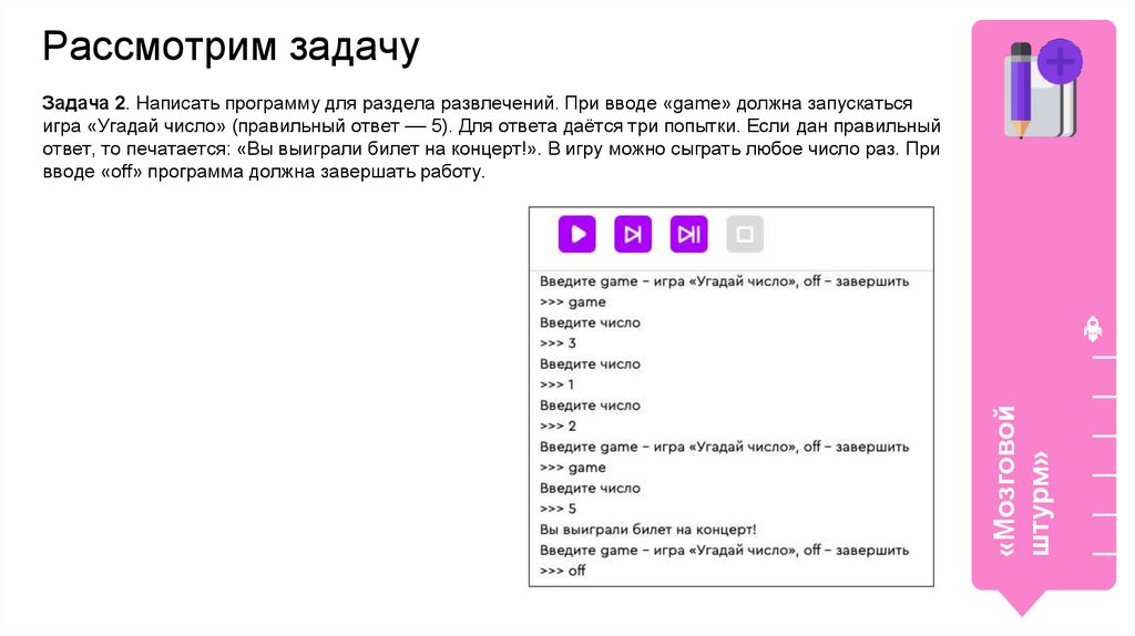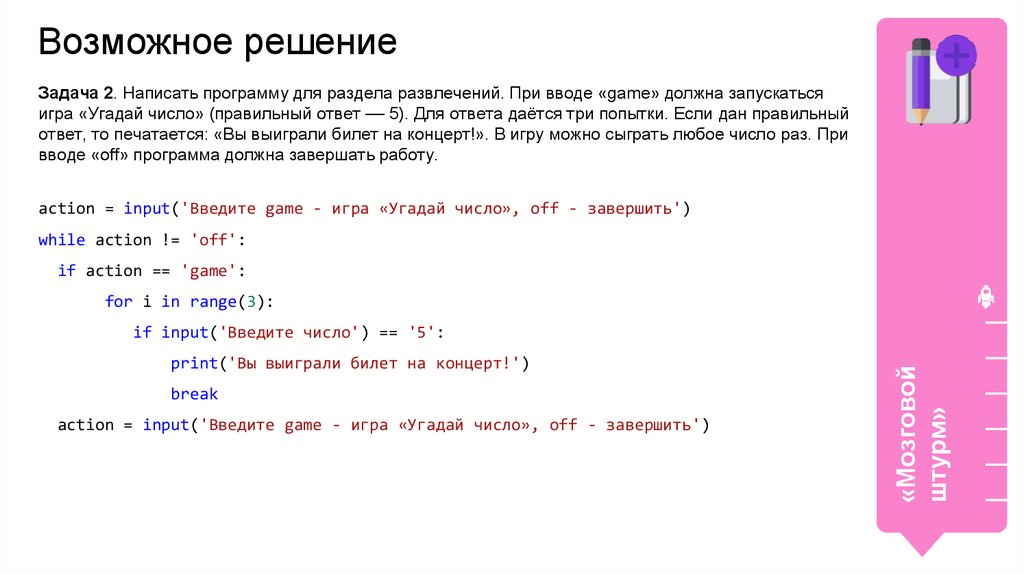 Возможное решениеЗадача 2. Написать программу для раздела развлечений. При вводе «game» должна запускаться