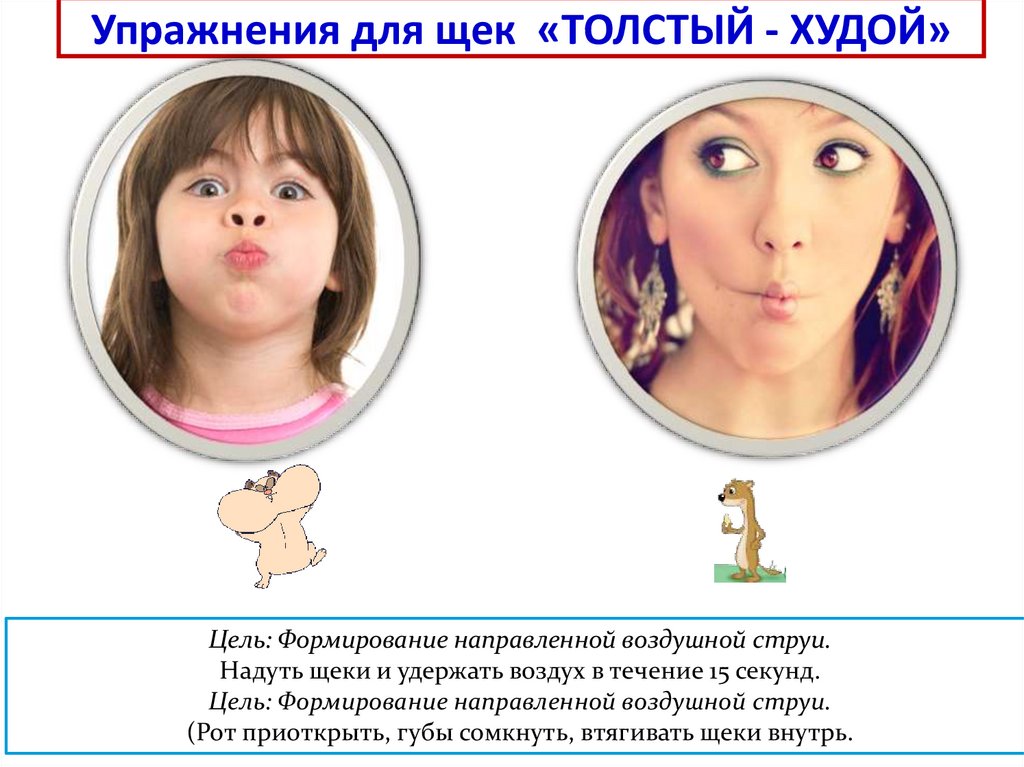 Упражнения для щек «ТОЛСТЫЙ - ХУДОЙ»Цель: Формирование направленной воздушной струи.