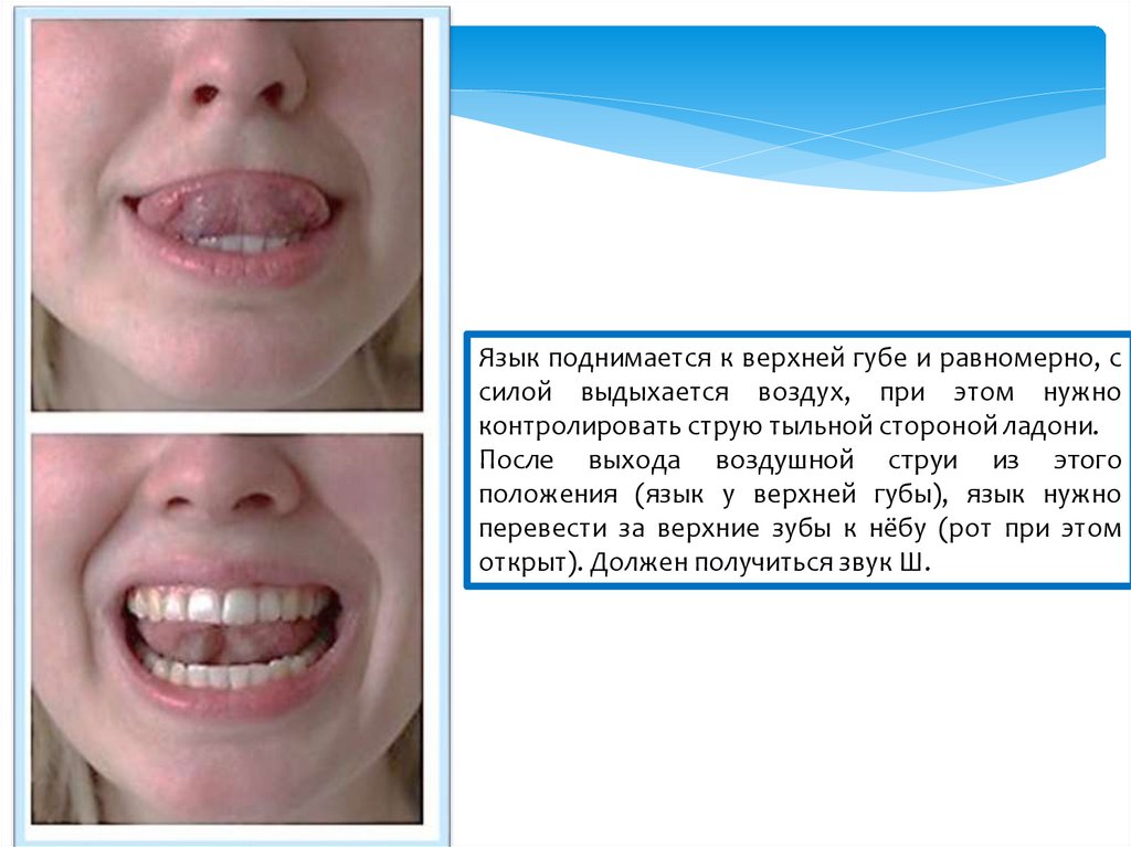 Язык поднимается к верхней губе и равномерно, ссилой выдыхается воздух, при этом нужно