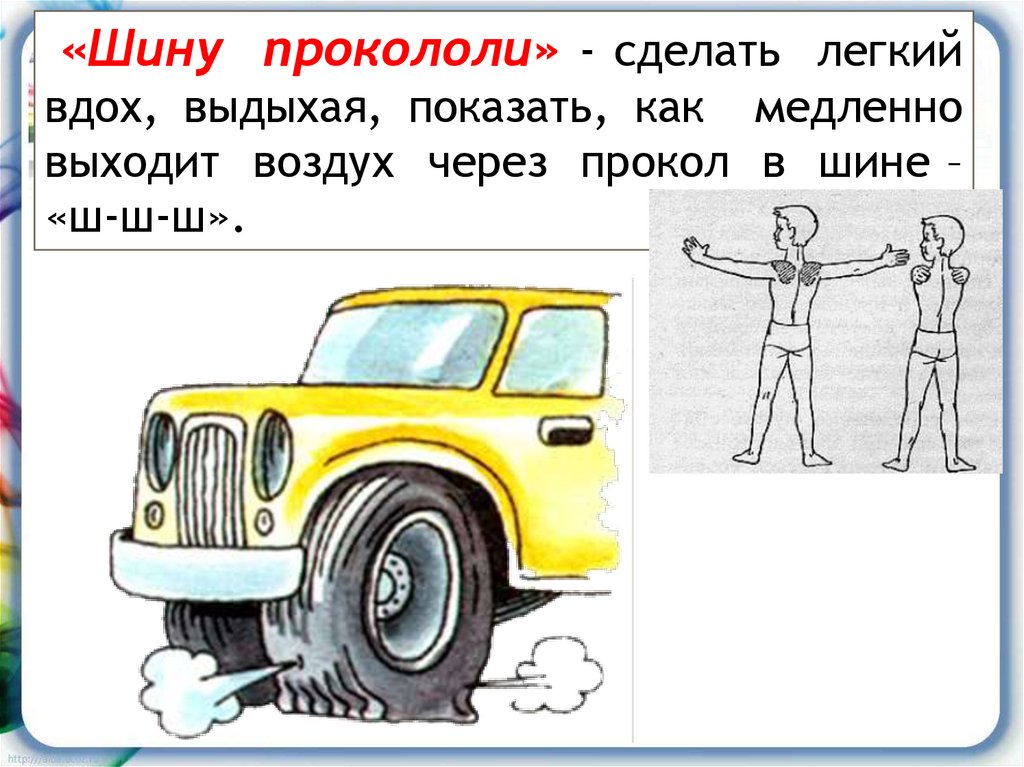 «Шину прокололи» - сделать легкийвдох, выдыхая, показать, как медленно