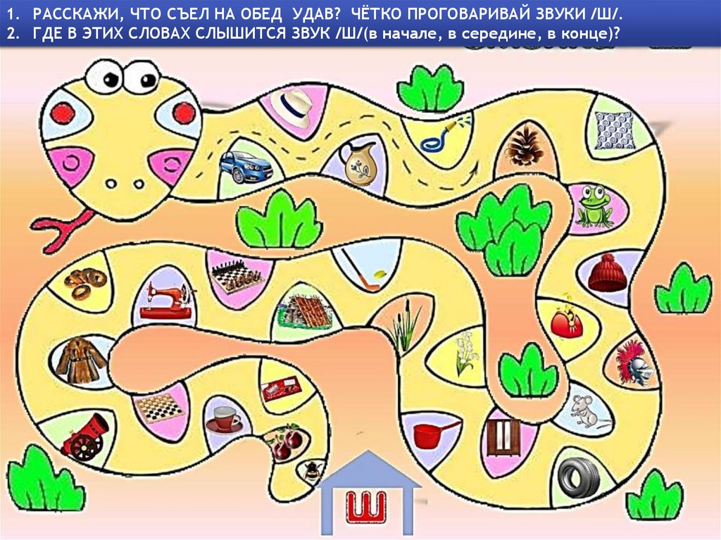 1. РАССКАЖИ, ЧТО СЪЕЛ НА ОБЕД УДАВ? ЧЁТКО ПРОГОВАРИВАЙ ЗВУКИ /Ш/.2. ГДЕ В ЭТИХ СЛОВАХ СЛЫШИТСЯ ЗВУК /Ш/(в начале, в середине, в конце)?