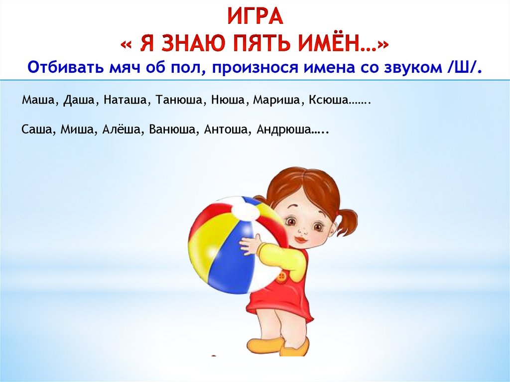 Отбивать мяч об пол, произнося имена со звуком /Ш/.Маша, Даша, Наташа, Танюша, Нюша, Мариша, Ксюша…….