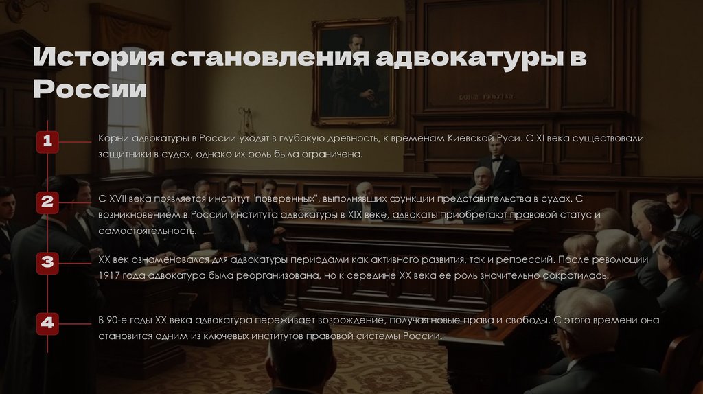 Корни адвокатуры в России уходят в глубокую древность, к временам Киевской Руси. С XI века существовали
