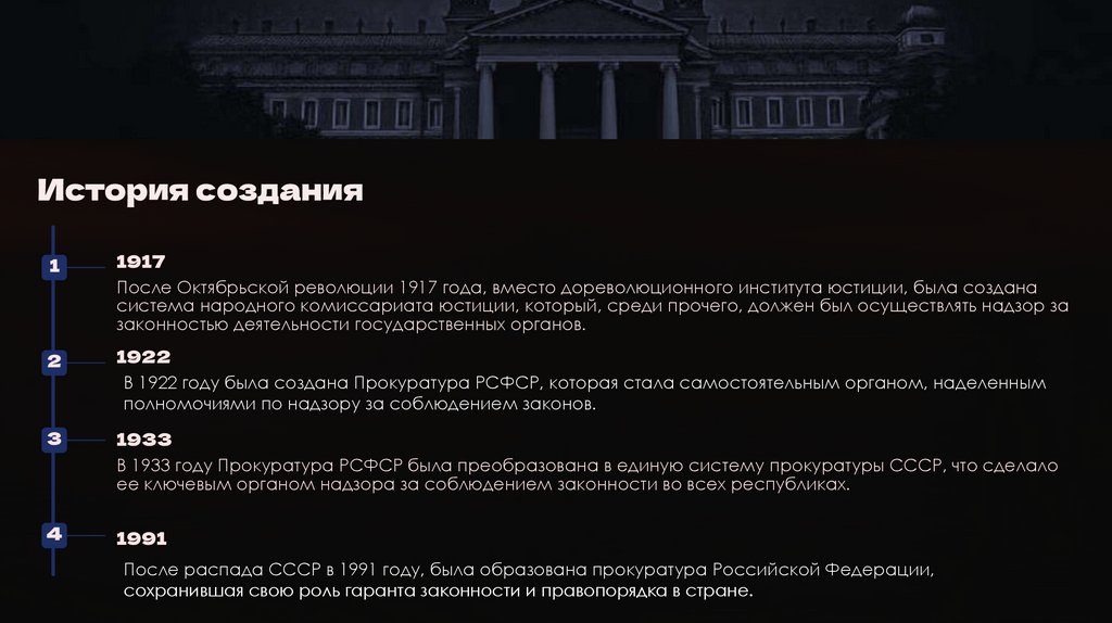 В 1922 году была создана Прокуратура РСФСР, которая стала самостоятельным органом, наделенным