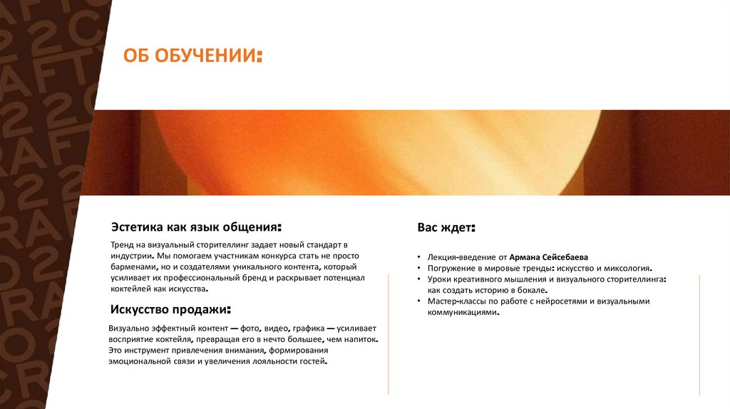 • Погружение в мировые тренды: искусство и миксология.