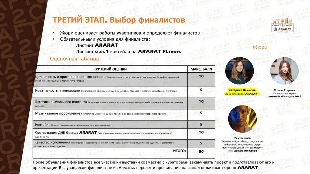 презентации В случае, если финалист не из Алматы, перелет и проживание на финал оплачивает бренд ARARAT