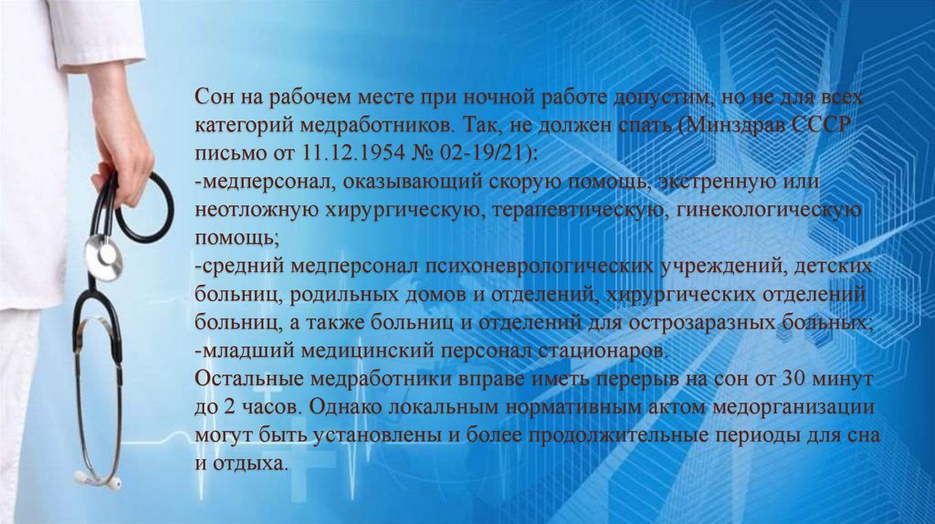 Сон на рабочем месте при ночной работе допустим, но не для всехкатегорий медработников. Так, не должен спать (Минздрав СССР