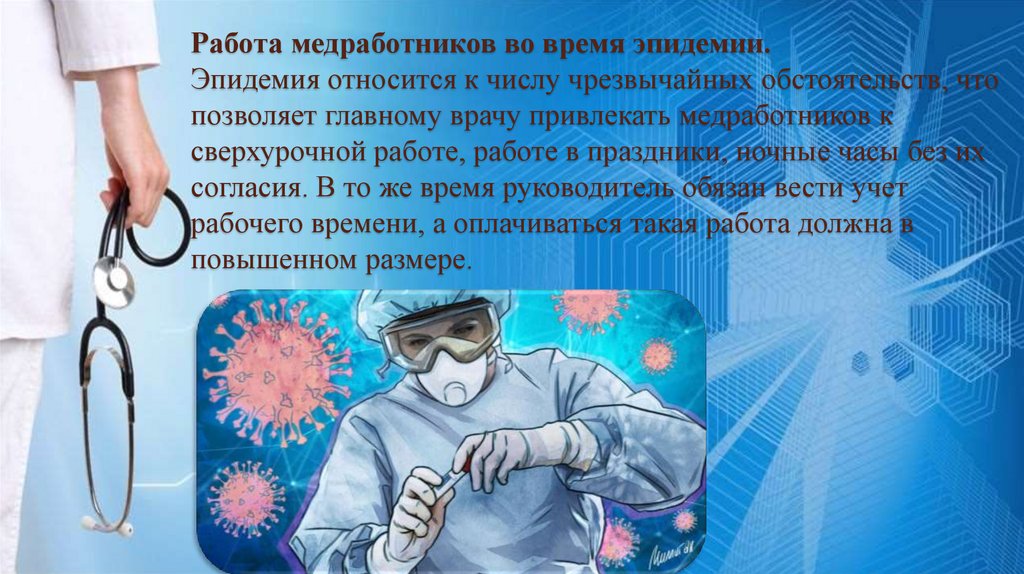Работа медработников во время эпидемии.Эпидемия относится к числу чрезвычайных обстоятельств, что