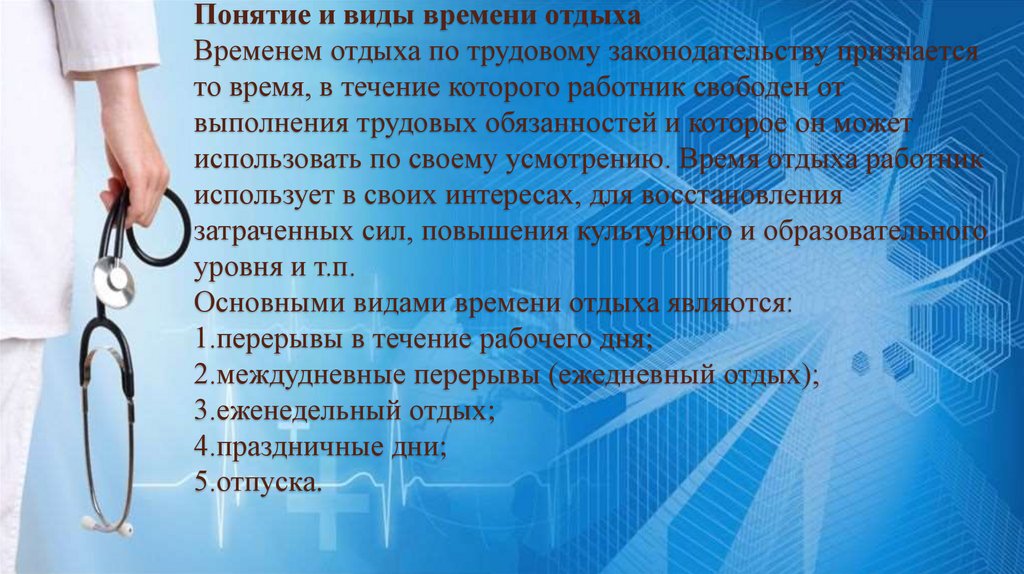 Понятие и виды времени отдыхаВременем отдыха по трудовому законодательству признается