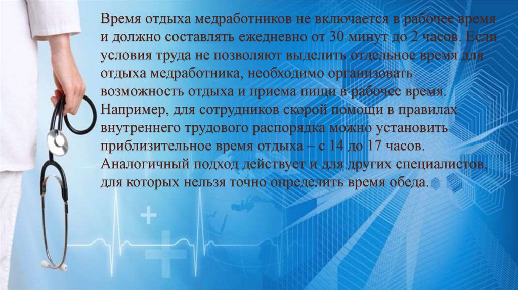 Время отдыха медработников не включается в рабочее времяи должно составлять ежедневно от 30 минут до 2 часов. Если