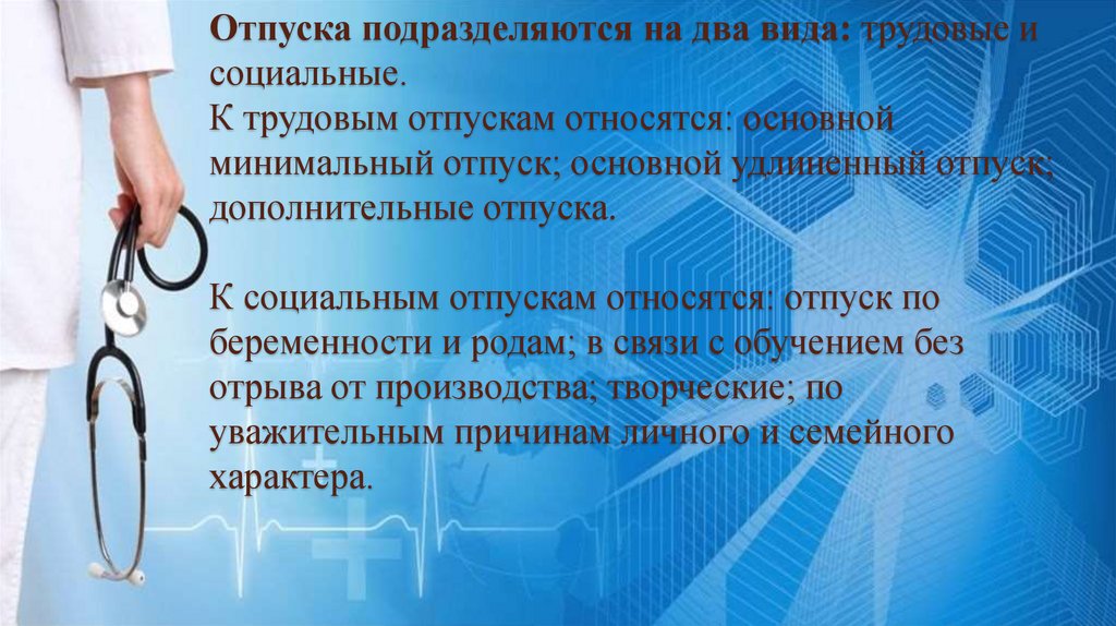 Отпуска подразделяются на два вида: трудовые исоциальные.