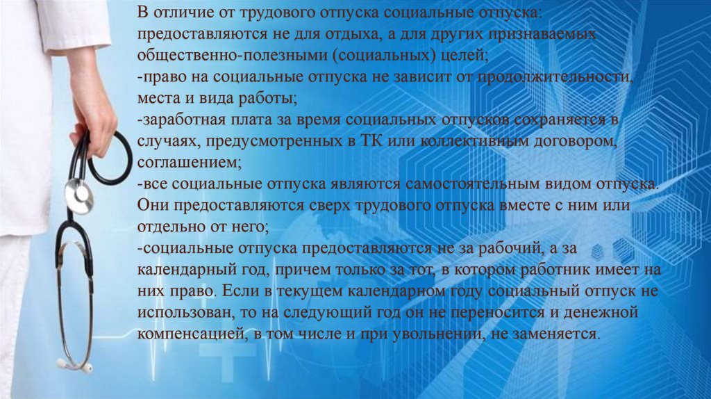 В отличие от трудового отпуска социальные отпуска:предоставляются не для отдыха, а для других признаваемых