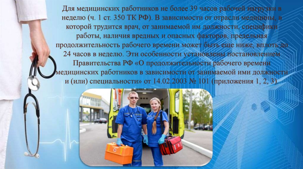 Для медицинских работников не более 39 часов рабочей нагрузки внеделю (ч. 1 ст. 350 ТК РФ). В зависимости от отрасли медицины, в
