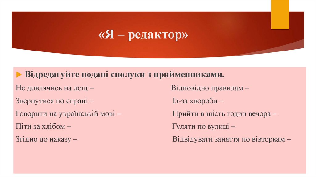 «Я – редактор»Відредагуйте подані сполуки з прийменниками.
