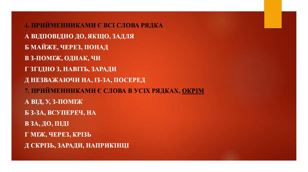 7. ПРИЙМЕННИКАМИ Є СЛОВА В УСІХ РЯДКАХ, ОКРІМ