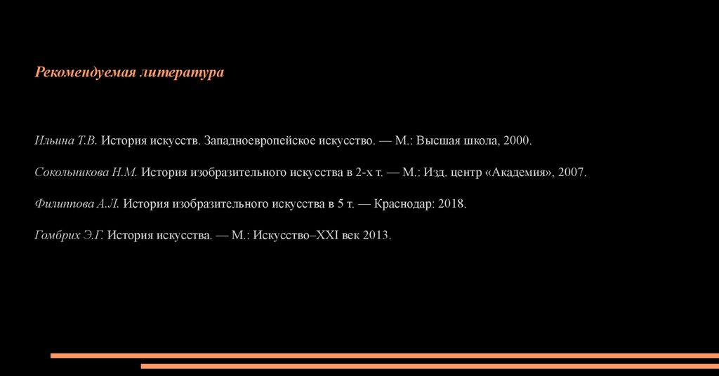 Рекомендуемая литератураИльина Т.В. История искусств. Западноевропейское искусство. — М.: Высшая школа, 2000.