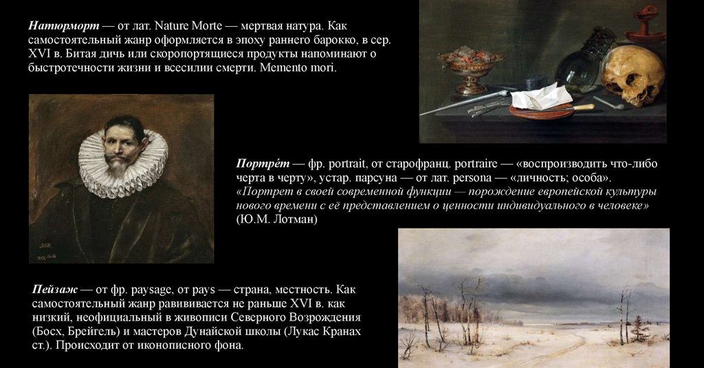 Натюрморт — от лат. Nature Morte — мертвая натура. Каксамостоятельный жанр оформляется в эпоху раннего барокко, в сер.