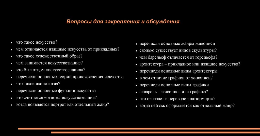 Вопросы для закрепления и обсуждениячто такое искусство?