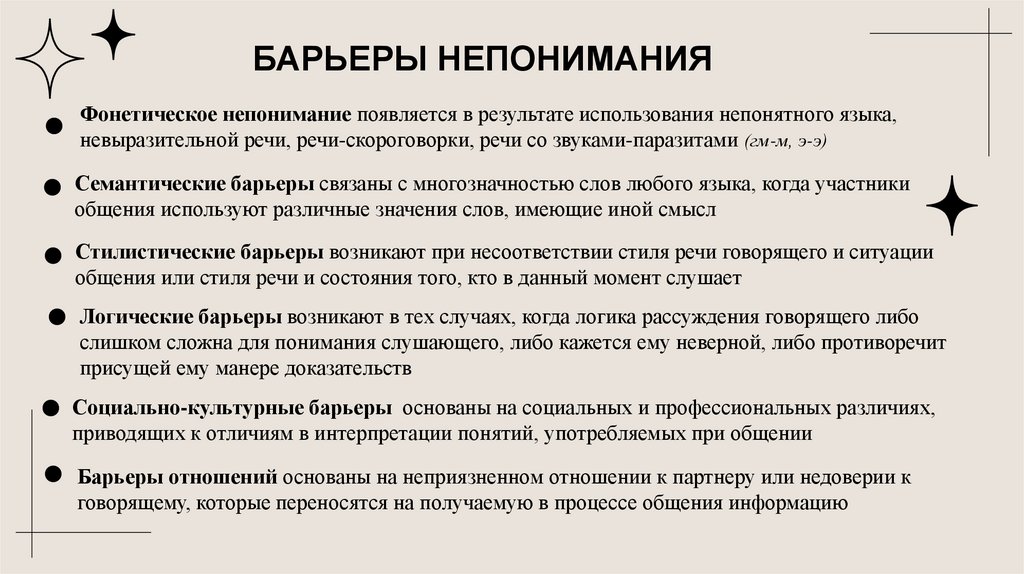 БАРЬЕРЫ НЕПОНИМАНИЯФонетическое непонимание появляется в результате использования непонятного языка,