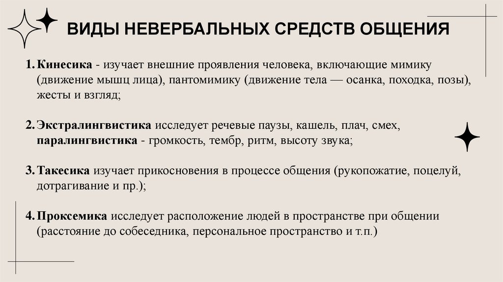 ВИДЫ НЕВЕРБАЛЬНЫХ СРЕДСТВ ОБЩЕНИЯ1. Кинесика - изучает внешние проявления человека, включающие мимику