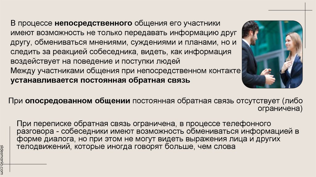 При опосредованном общении постоянная обратная связь отсутствует (либо