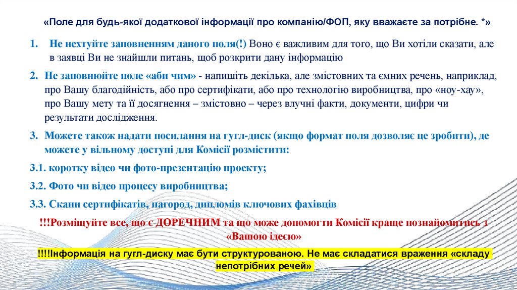 (повна назва, організаційно-правова форма; сфера діяльності вашого бізнесу; форма оподаткування; інформація про контактну особу; юридична та