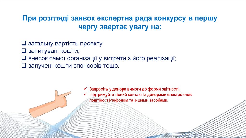 При розгляді заявок експертна рада конкурсу в першучергу звертає увагу на: