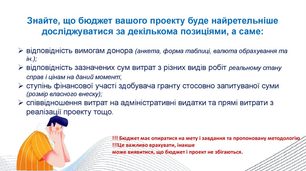 Знайте, що бюджет вашого проекту буде найретельнішедосліджуватися за декількома позиціями, а саме: