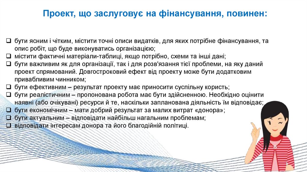 Проект, що заслуговує на фінансування, повинен:бути ясним і чітким, містити точні описи видатків, для яких потрібне фінансування, та