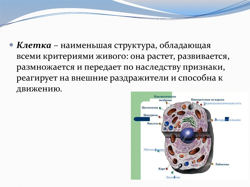 Клетка – наименьшая структура, обладающаявсеми критериями живого: она растет, развивается,