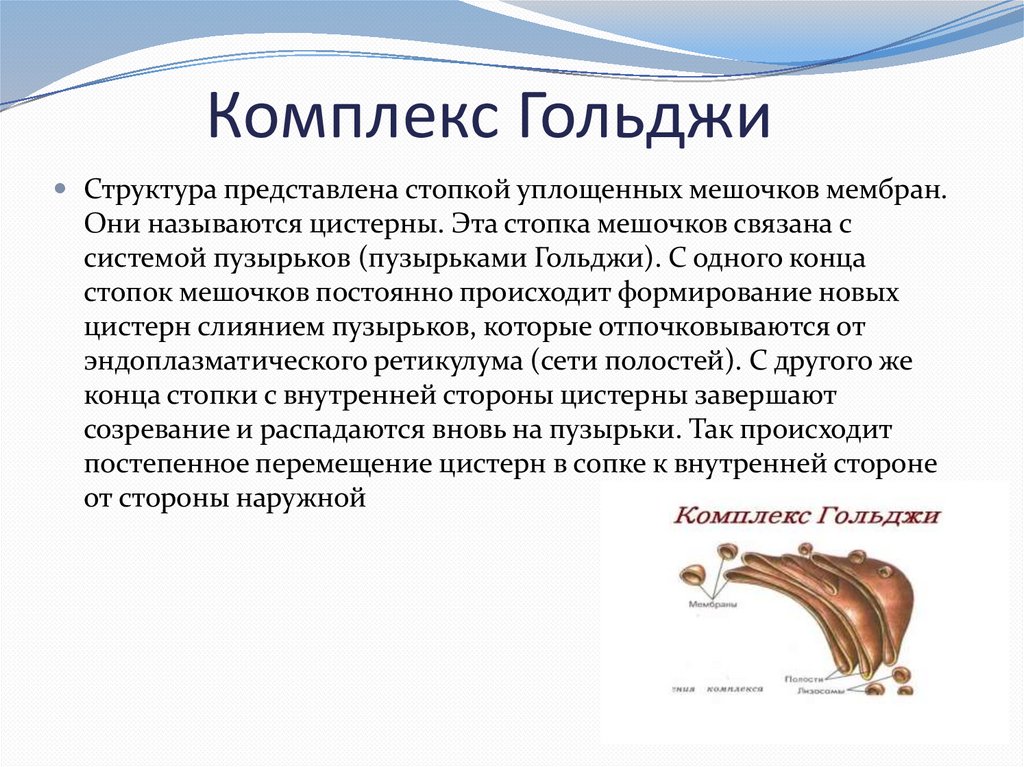 Комплекс ГольджиСтруктура представлена стопкой уплощенных мешочков мембран.