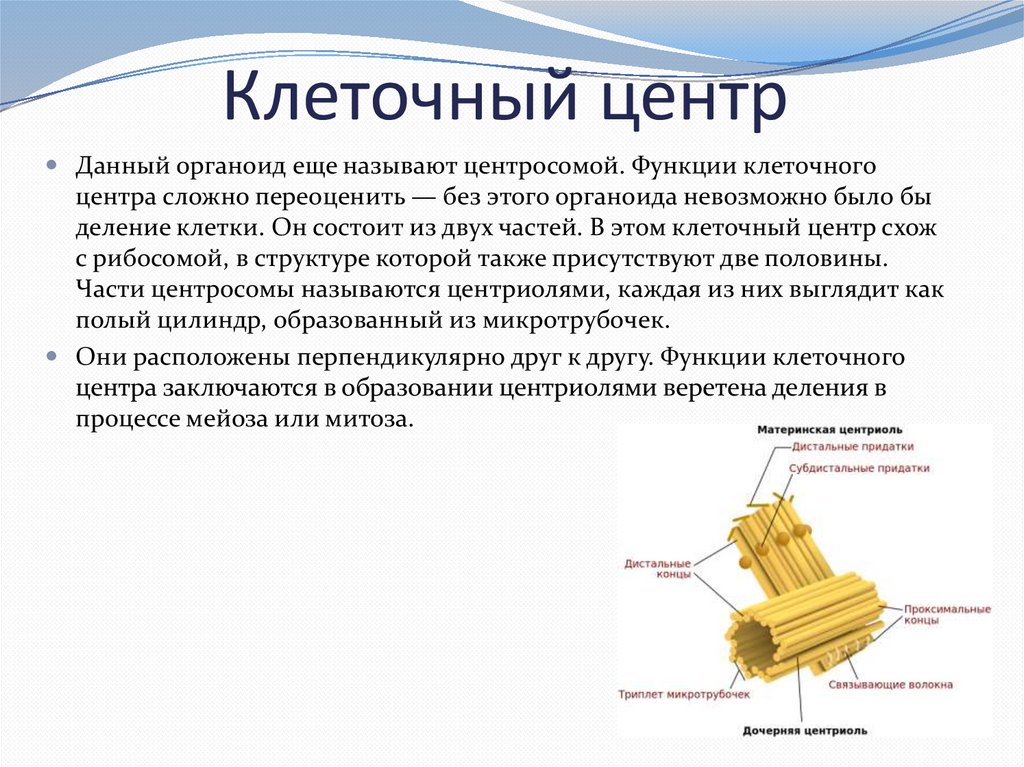 Клеточный центрДанный органоид еще называют центросомой. Функции клеточного