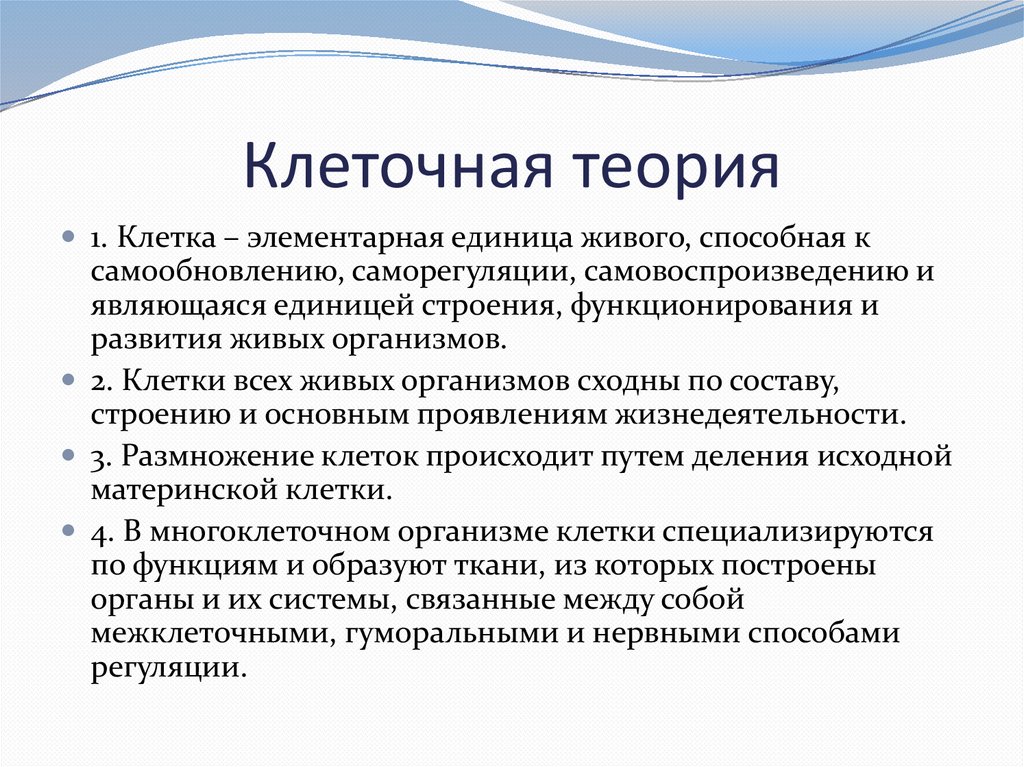 Клеточная теория1. Клетка – элементарная единица живого, способная к