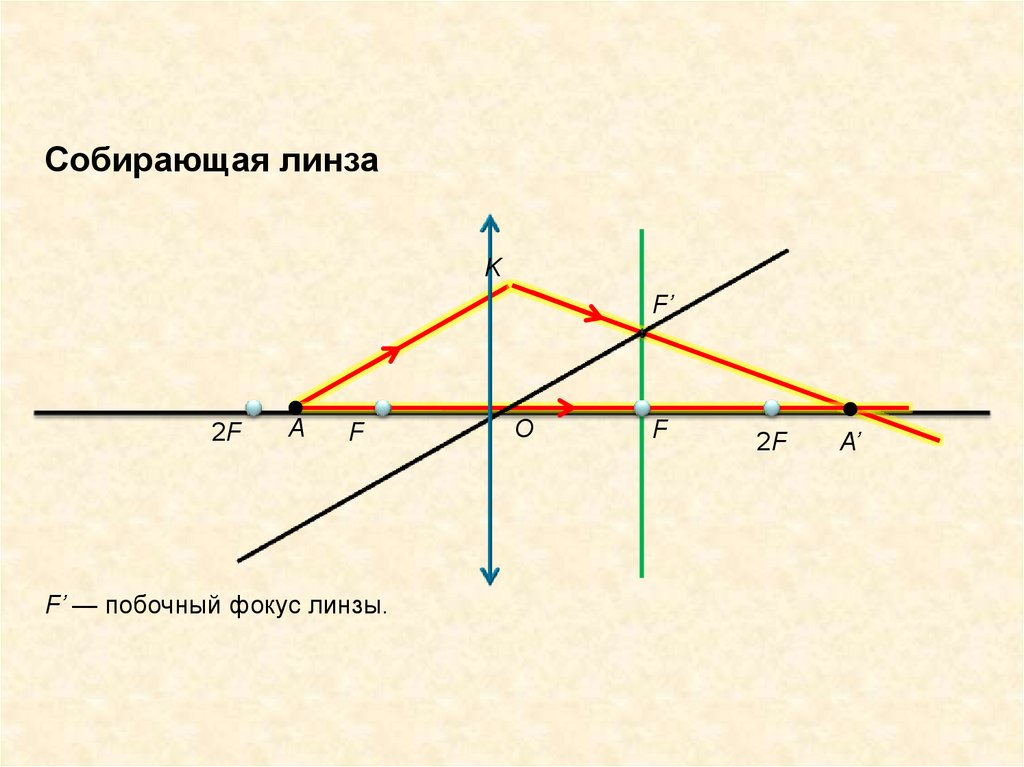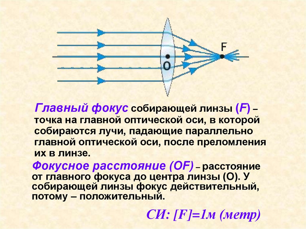 Главный фокус собирающей линзы (F) –точка на главной оптической оси, в которой
