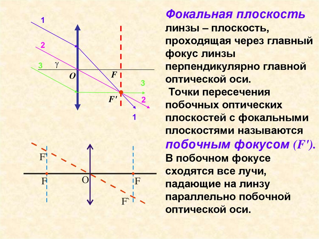 15. Фокальная плоскость линзы – плоскость, проходящая через главный фокус линзы перпендикулярно главной оптической оси. Точки