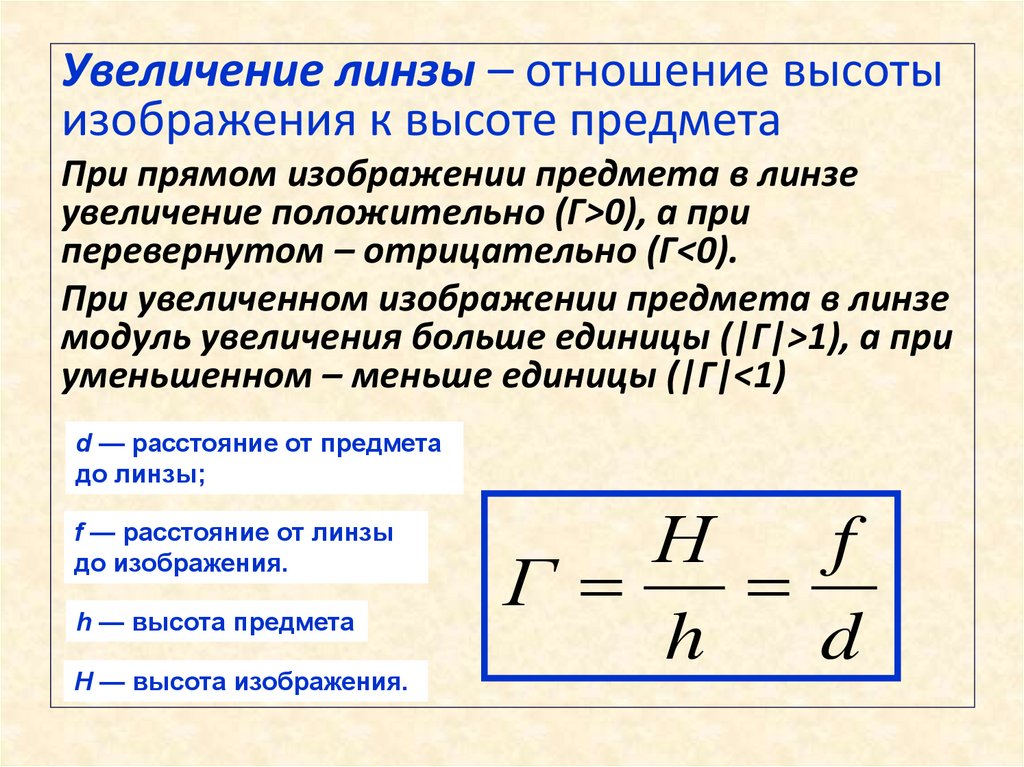 Увеличение линзы – отношение высотыизображения к высоте предмета