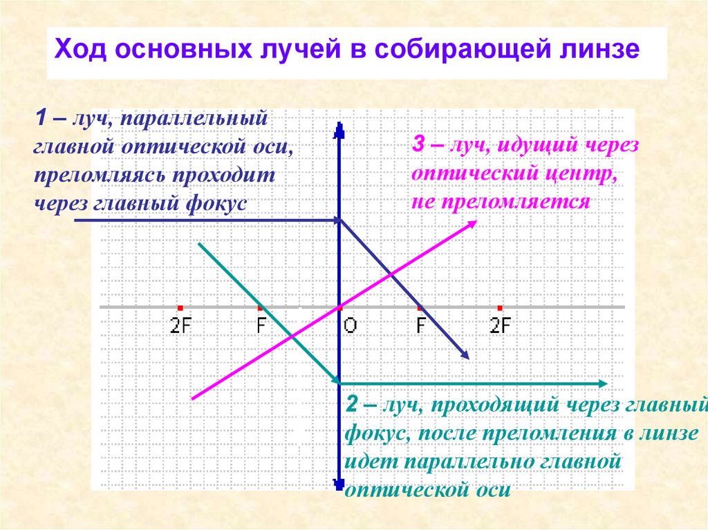 Ход основных лучей в собирающей линзе1 – луч, параллельный