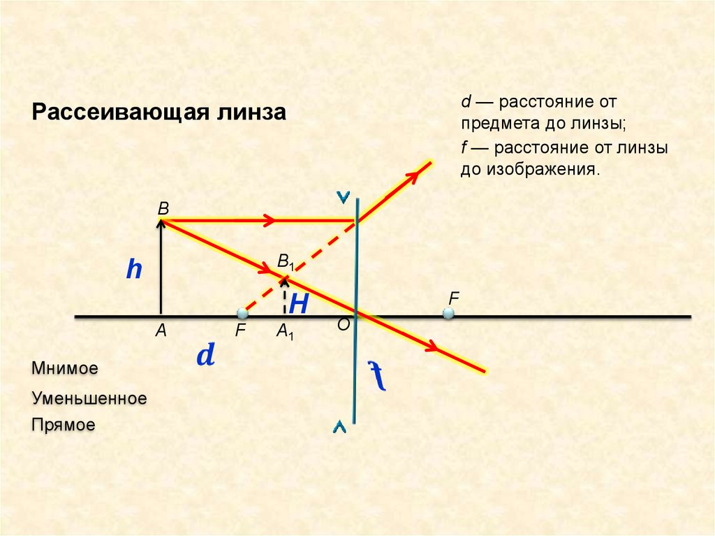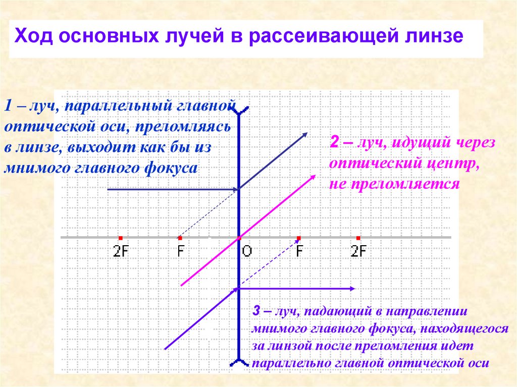Ход основных лучей в рассеивающей линзе1 – луч, параллельный главной