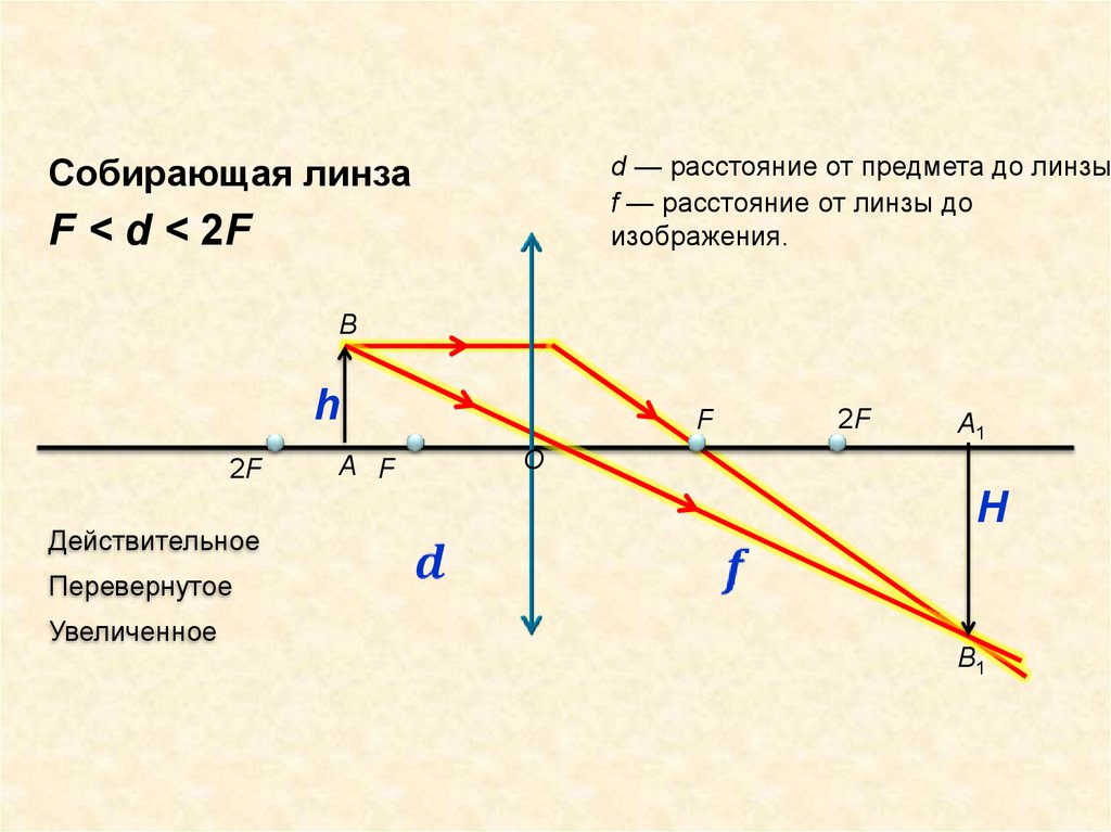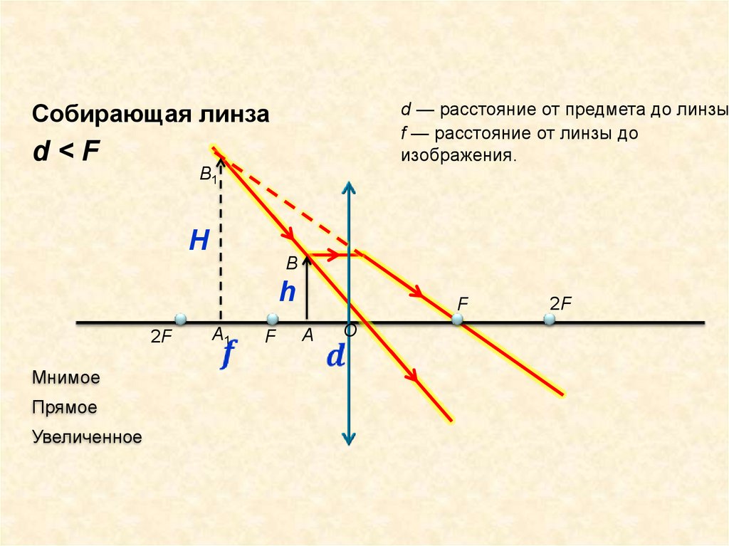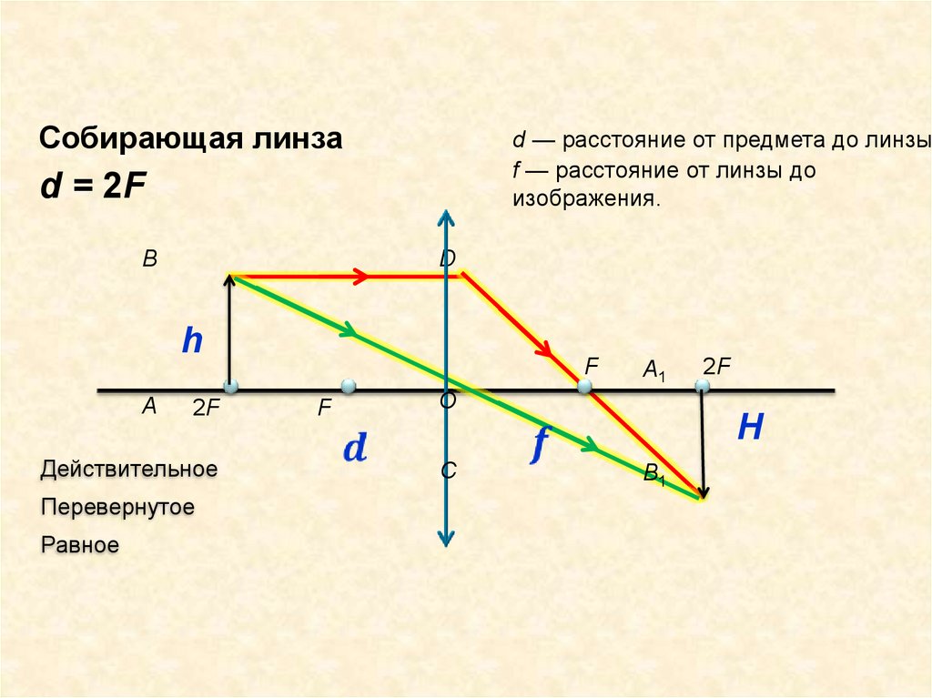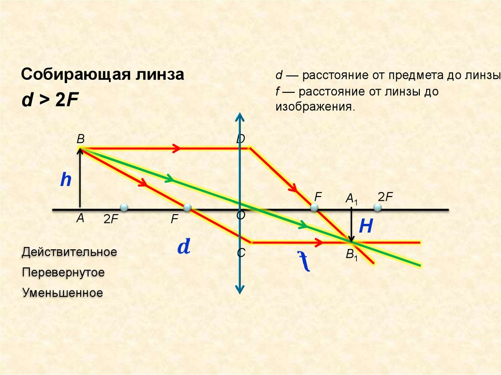 d — расстояние от предмета до линзы;f — расстояние от линзы до