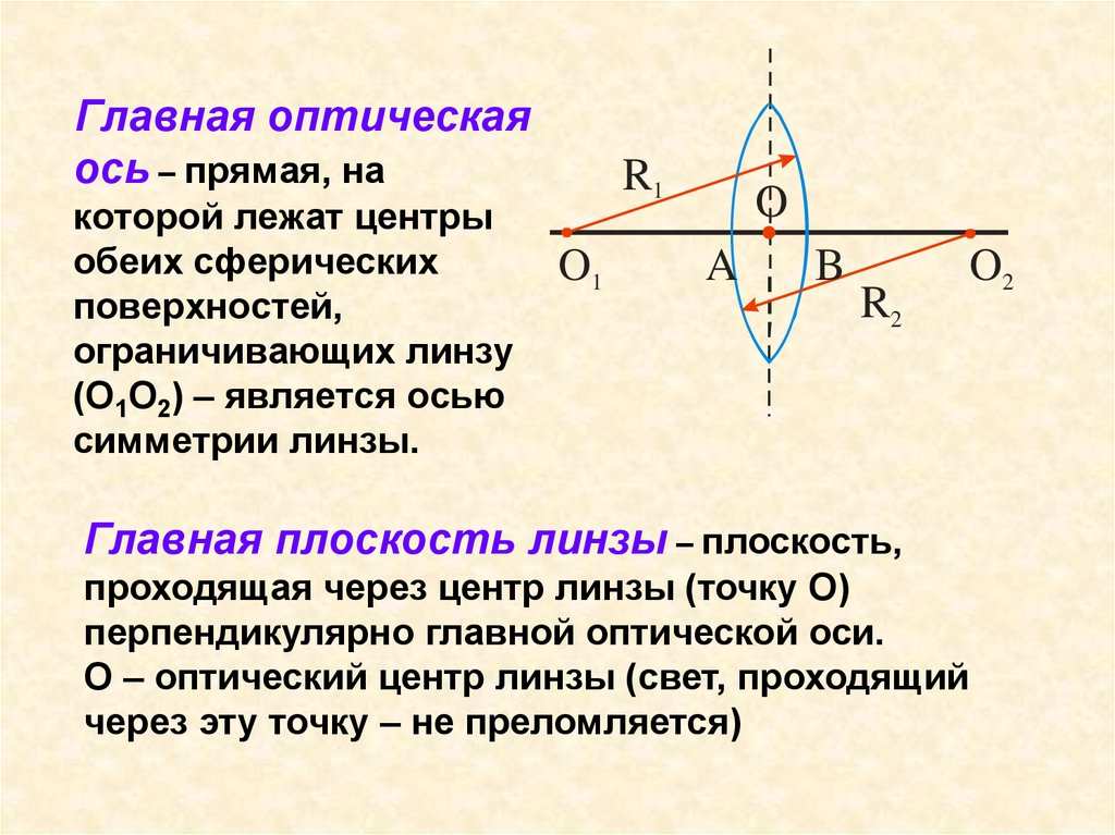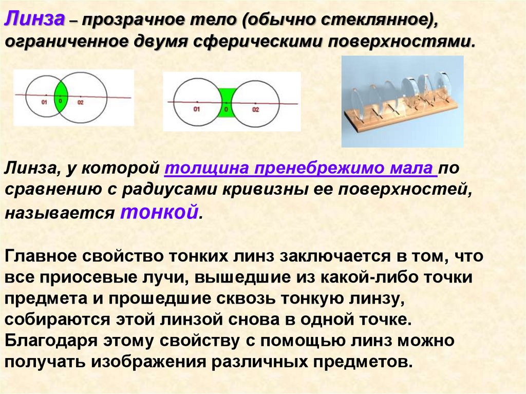 9. Линза – прозрачное тело (обычно стеклянное), ограниченное двумя сферическими поверхностями. Линза, у которой толщина