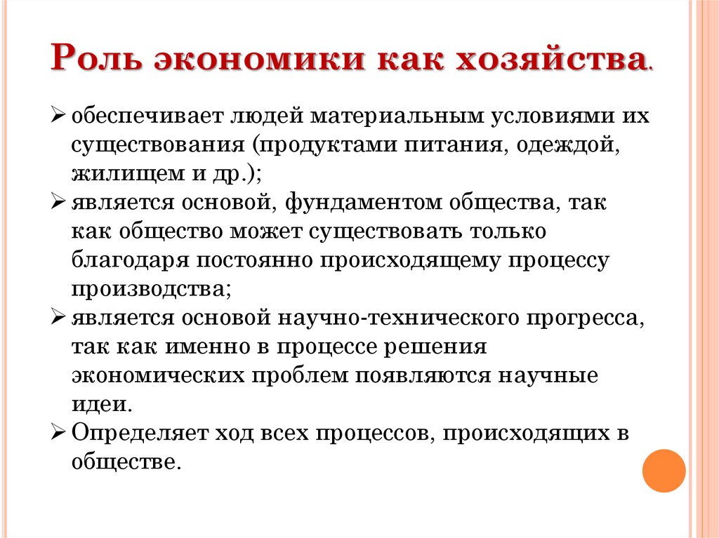 Роль экономики как хозяйства.обеспечивает людей материальным условиями их