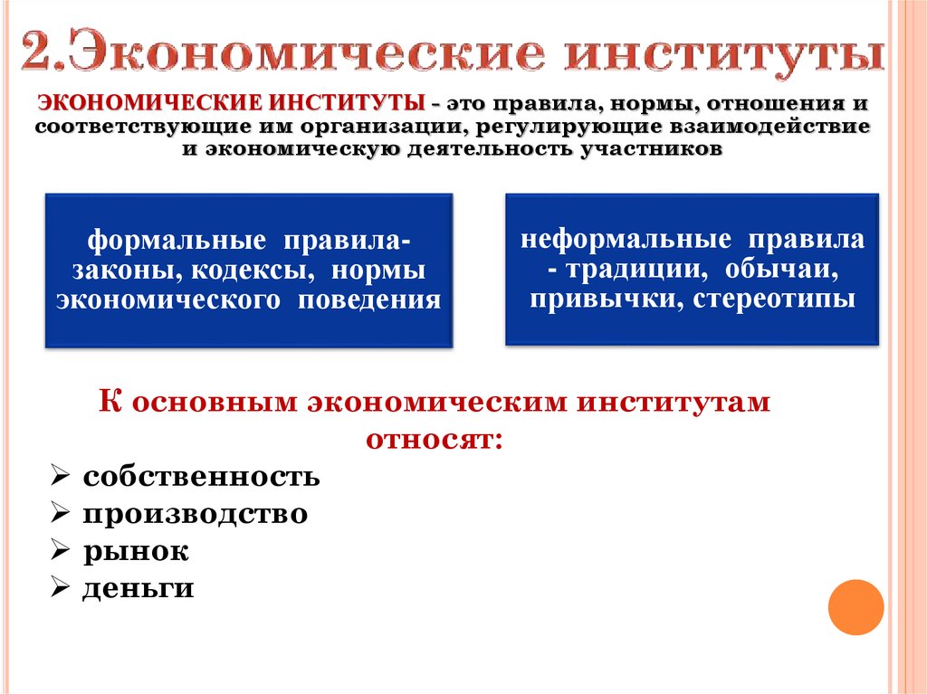 ЭКОНОМИЧЕСКИЕ ИНСТИТУТЫ - это правила, нормы, отношения исоответствующие им организации, регулирующие взаимодействие