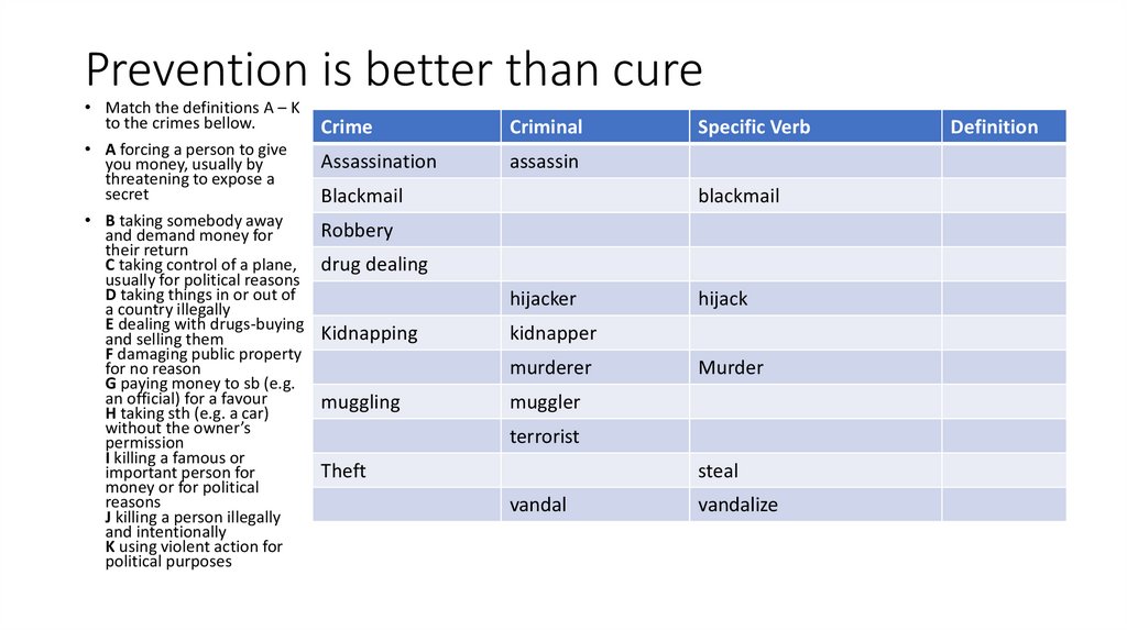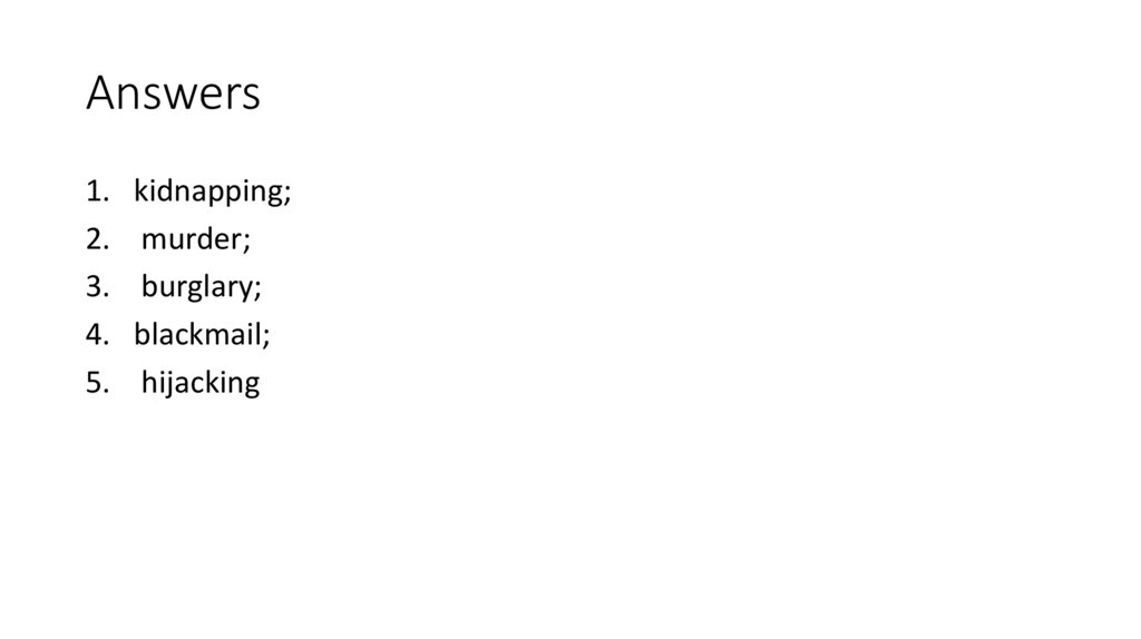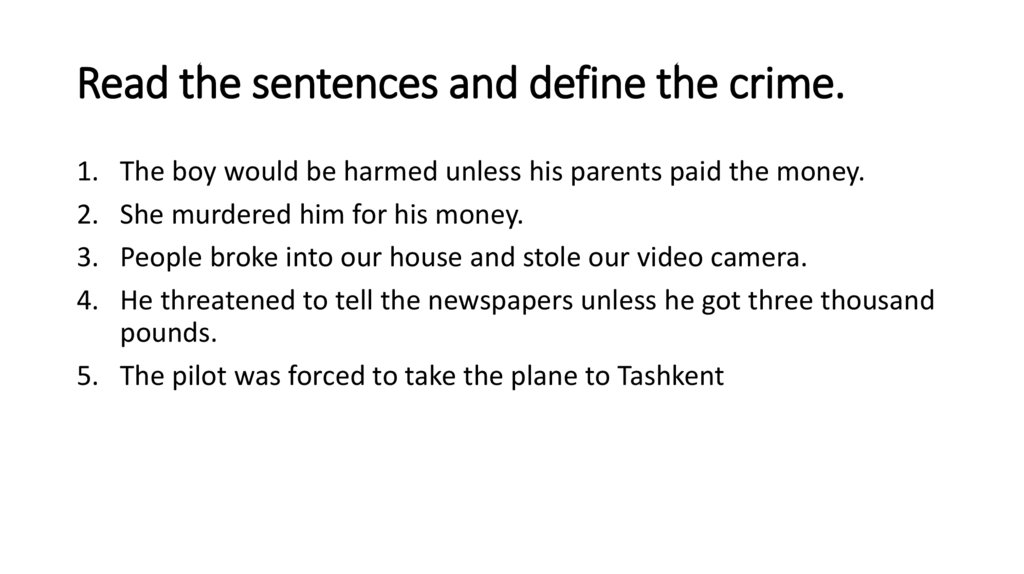 Read the sentences and define the crime.1. The boy would be harmed unless his parents paid the money.