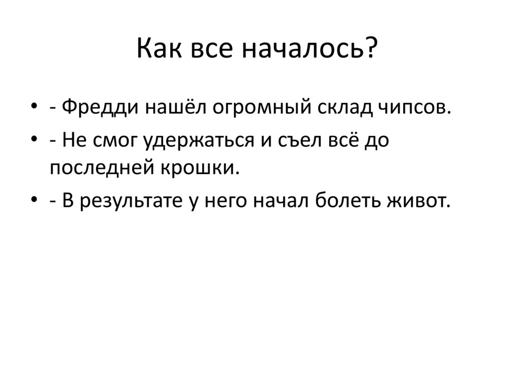 Как все началось?• - Фредди нашёл огромный склад чипсов.