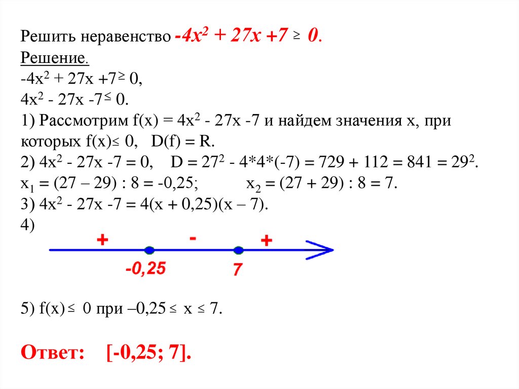 Решить неравенство -4х2 + 27х +7 0.Решение.
