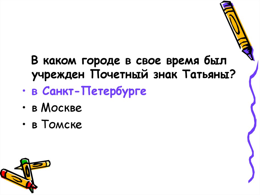 В каком городе в свое время былучрежден Почетный знак Татьяны?