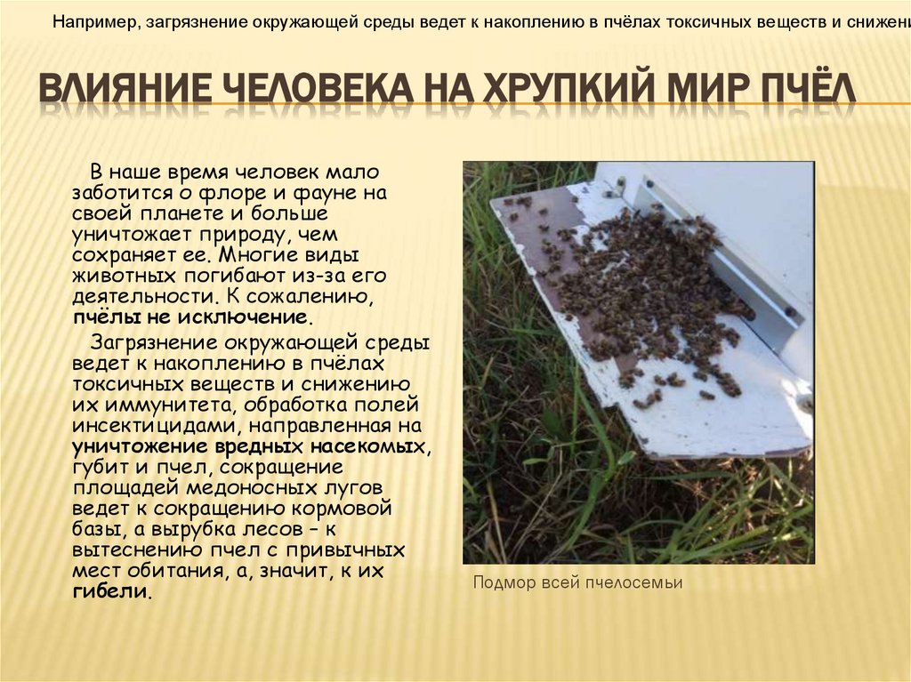 Например, загрязнение окружающей среды ведет к накоплению в пчёлах токсичных веществ и снижениВЛИЯНИЕ ЧЕЛОВЕКА НА ХРУПКИЙ МИР ПЧЁЛ