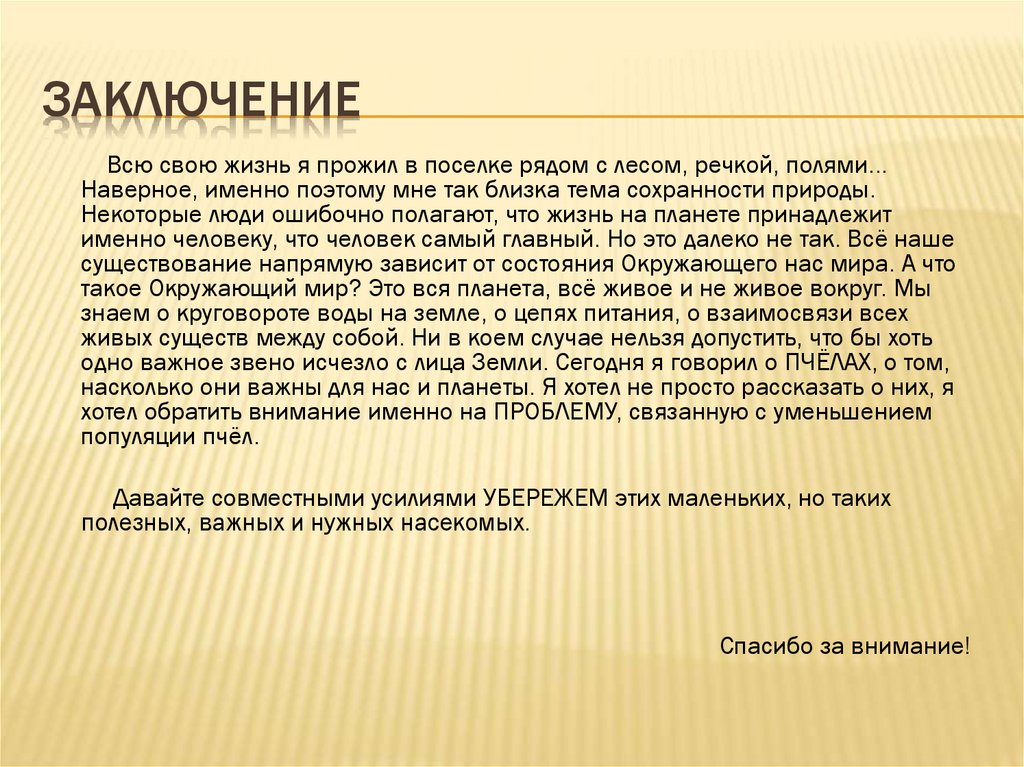 ЗАКЛЮЧЕНИЕВсю свою жизнь я прожил в поселке рядом с лесом, речкой, полями...