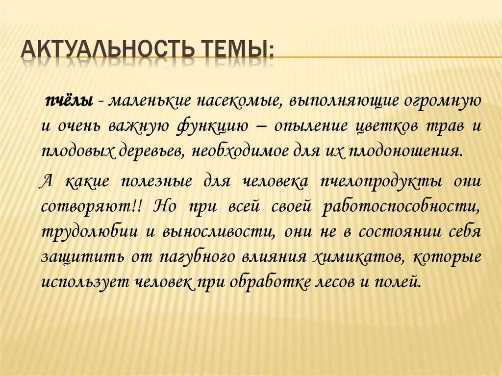 АКТУАЛЬНОСТЬ ТЕМЫ:пчёлы - маленькие насекомые, выполняющие огромную